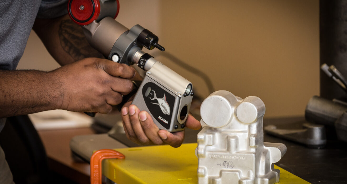 Ingeniería también utiliza un brazo de escáner 3-D Romer. Esto le da a nuestro equipo la capacidad de escanear geometría compleja para los fines de la ingeniería inversa o la superposición de la pieza escaneada sobre un modelo 3-D para comparación.